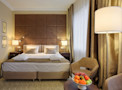 «Стандарт комфорт» оформлен в современном стиле. Нейтральные тона (мягкие песочные и нежно-сливочные оттенки) оживляют эффектные аксессуары. Картины привносят в декор нотки эко-стиля, торшеры на длинных ножках задают атмосферу домашнего уюта и тепла, а мебель из массива дуба усиливает ауру респектабельности.