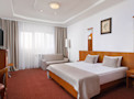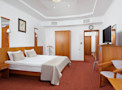 Просторный двухместный номер оформлен в лучших традициях минимализма. Основной цвет стен и потолка – белый, эффектно подчеркнутый контрастными коричневыми оттенками. Большие окна, обилие мягкого рассеянного света и отсутствие вычурных декоративных элементов задают ощущение воздушности и простора. Ковры насыщенного гранатового цвета привносят в интерьер атмосферу уюта и респектабельности.